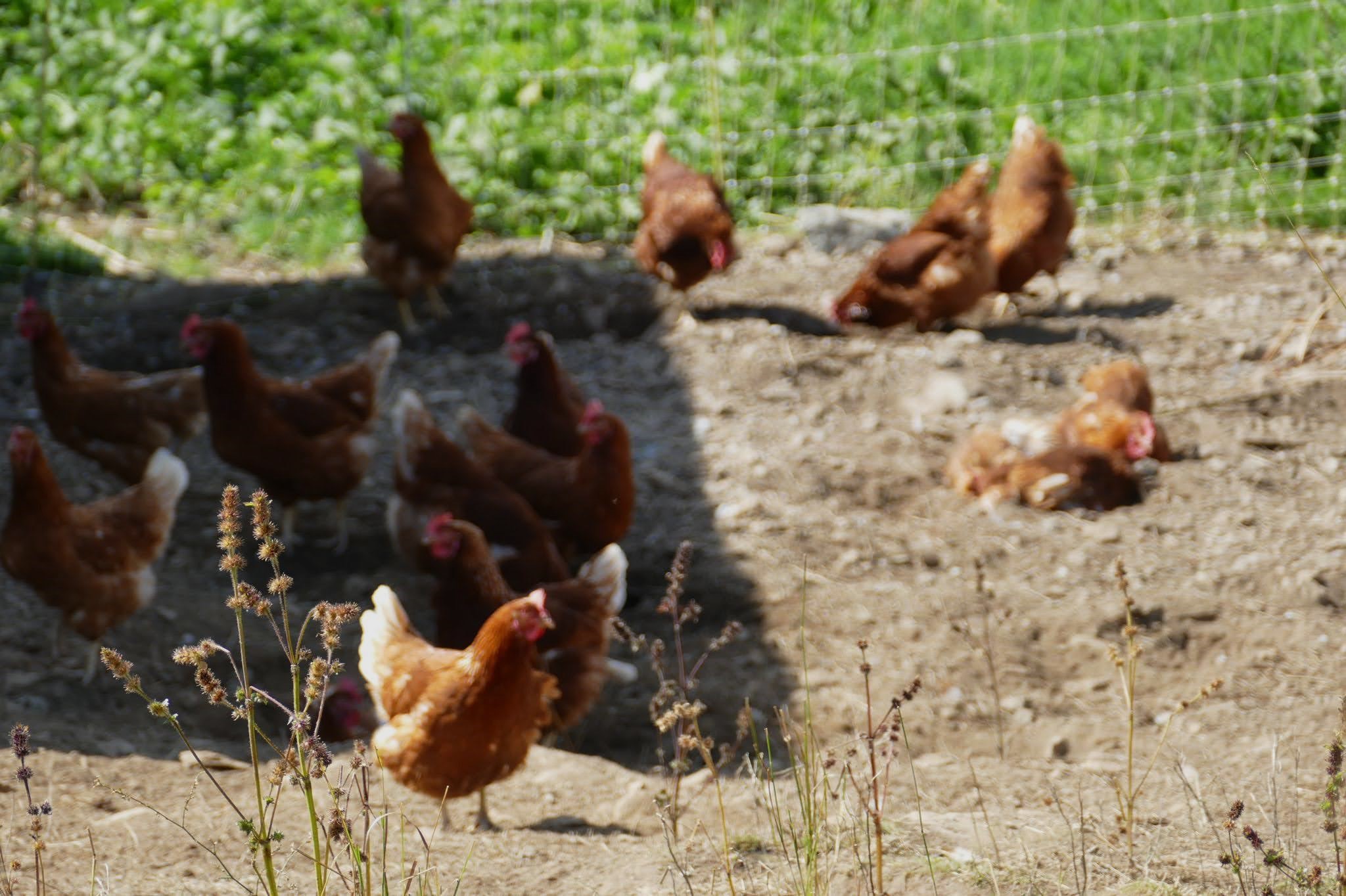 Im Sommer haben die Hühner tagsüber freien Auslauf auf der umliegenden Wiese und im Winter steht ihnen ein gedeckter Aussenbereich zur Verfügung.